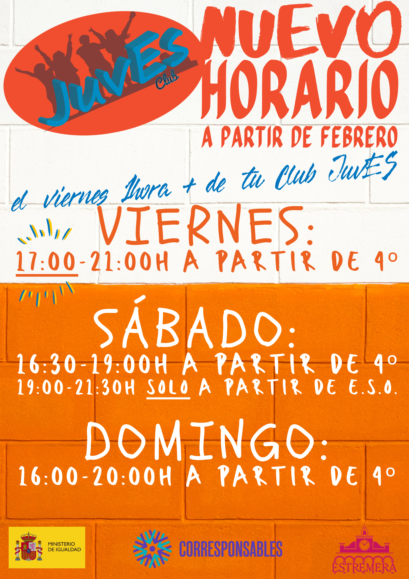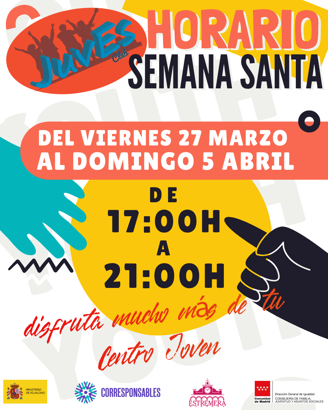 Todas las actividades y mantenimiento del Club JuvEs es gracias en parte al PLAN CORRESPONSABLES del Ministerio de Igualdad y Consejería de Familia, Juventud y Asuntos Sociales de la Comunidad de Madrid.