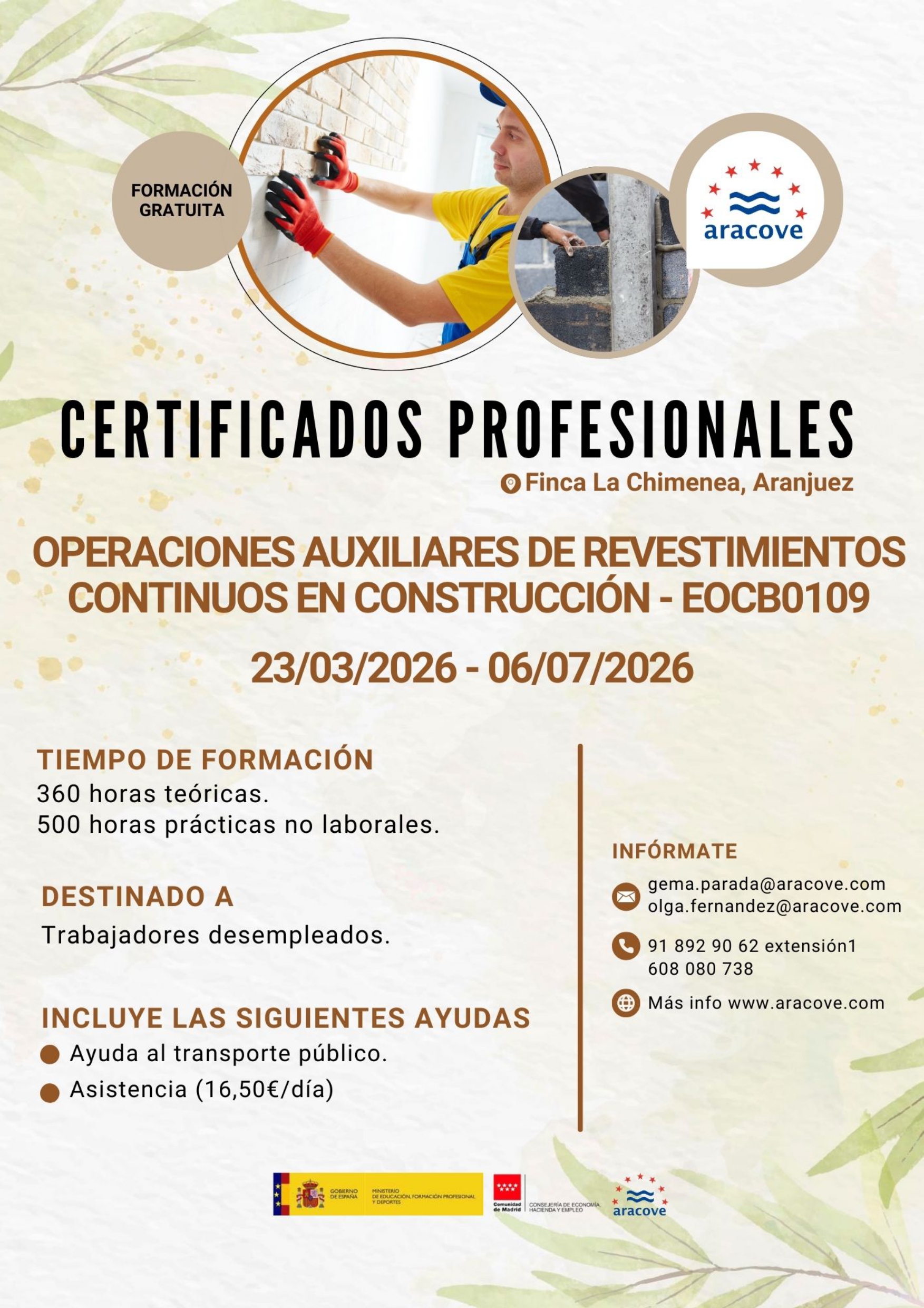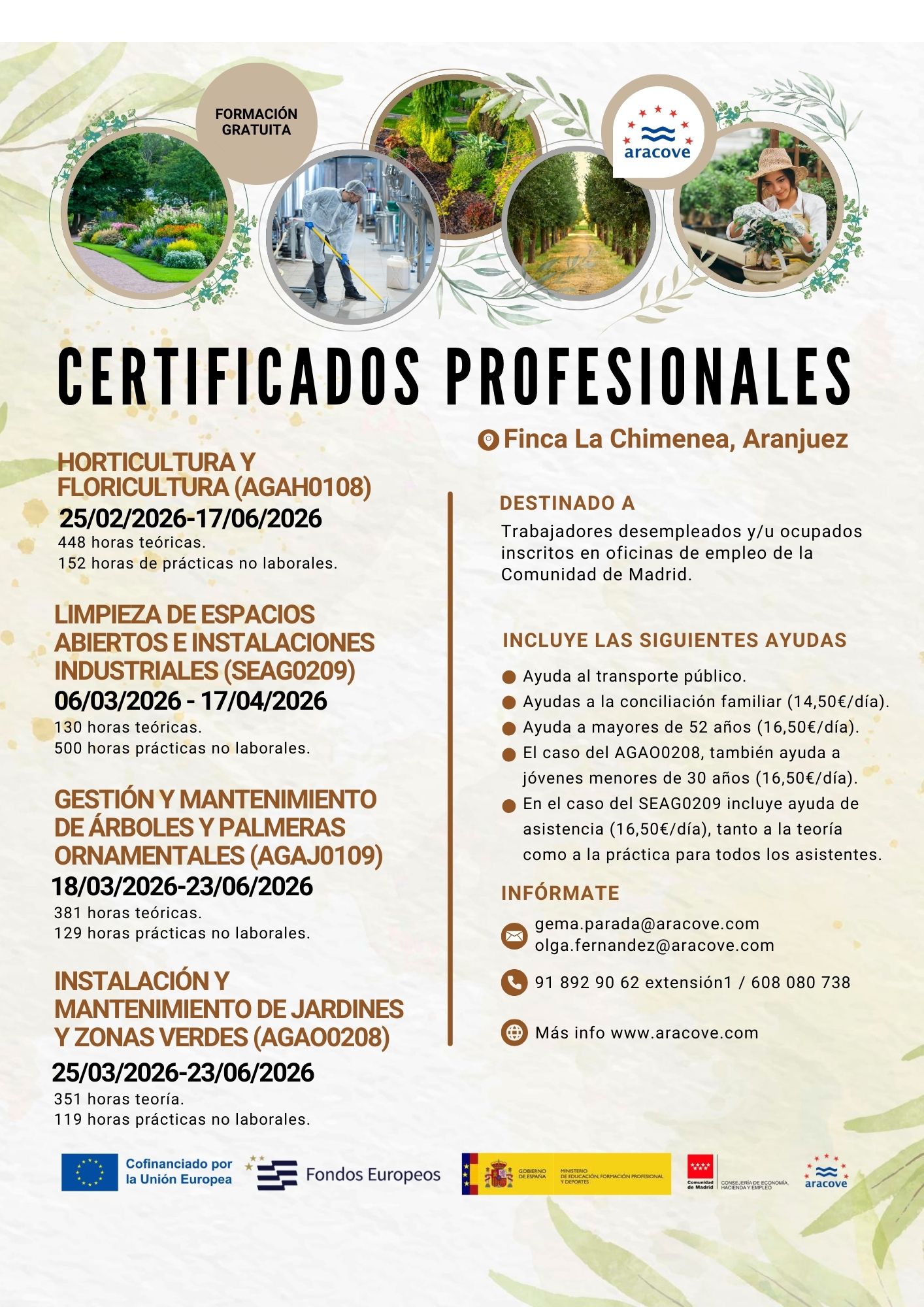 - Certificados de Profesionalidad gratuitos de mayor duración, en el ámbito de la horticultura-floricultura y la elaboración de conservas vegetales. Requisito desempleados y trabajadores inscritos en oficinas de empleo de la Comunidad de Madrid. Esta formación incluye: